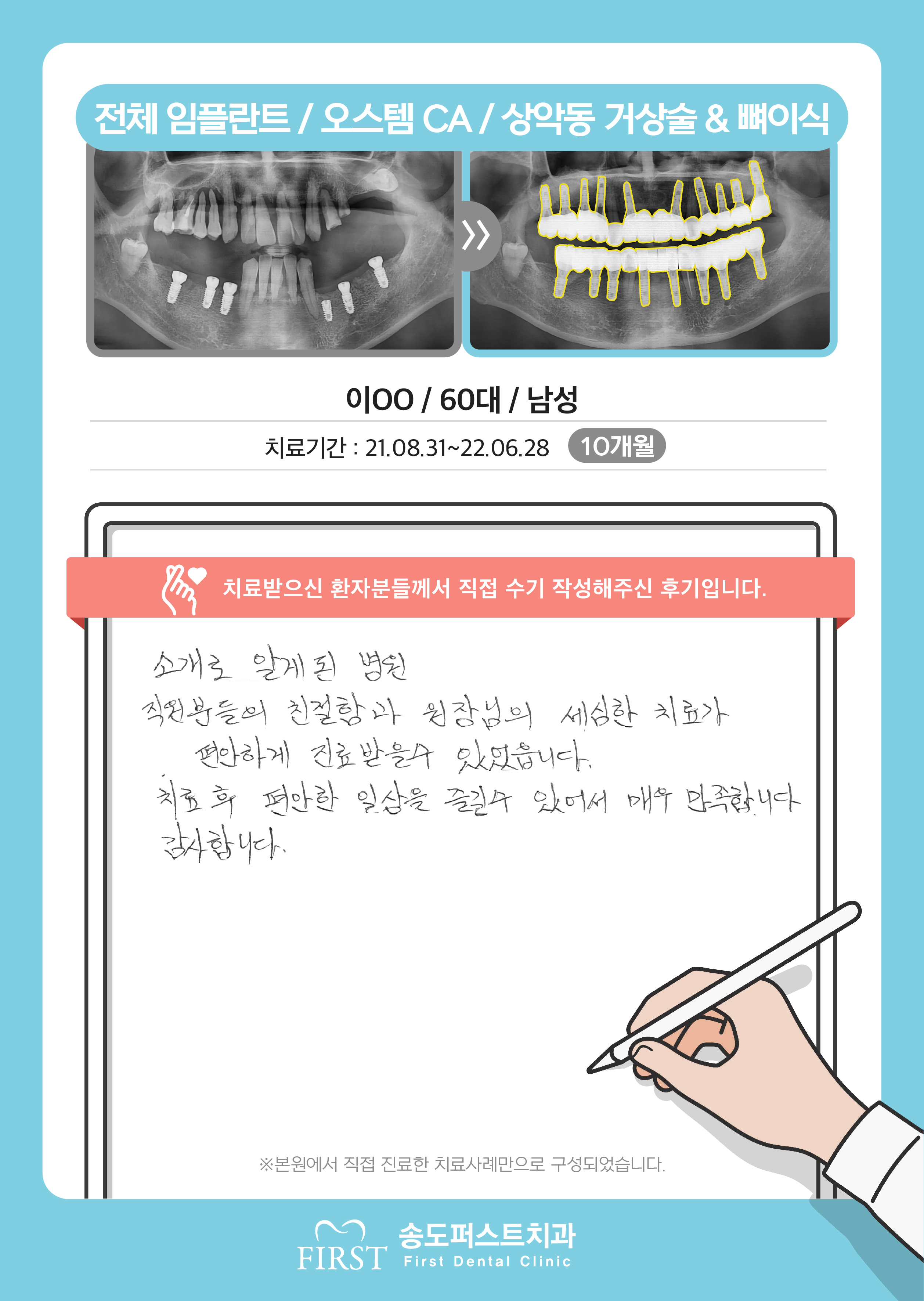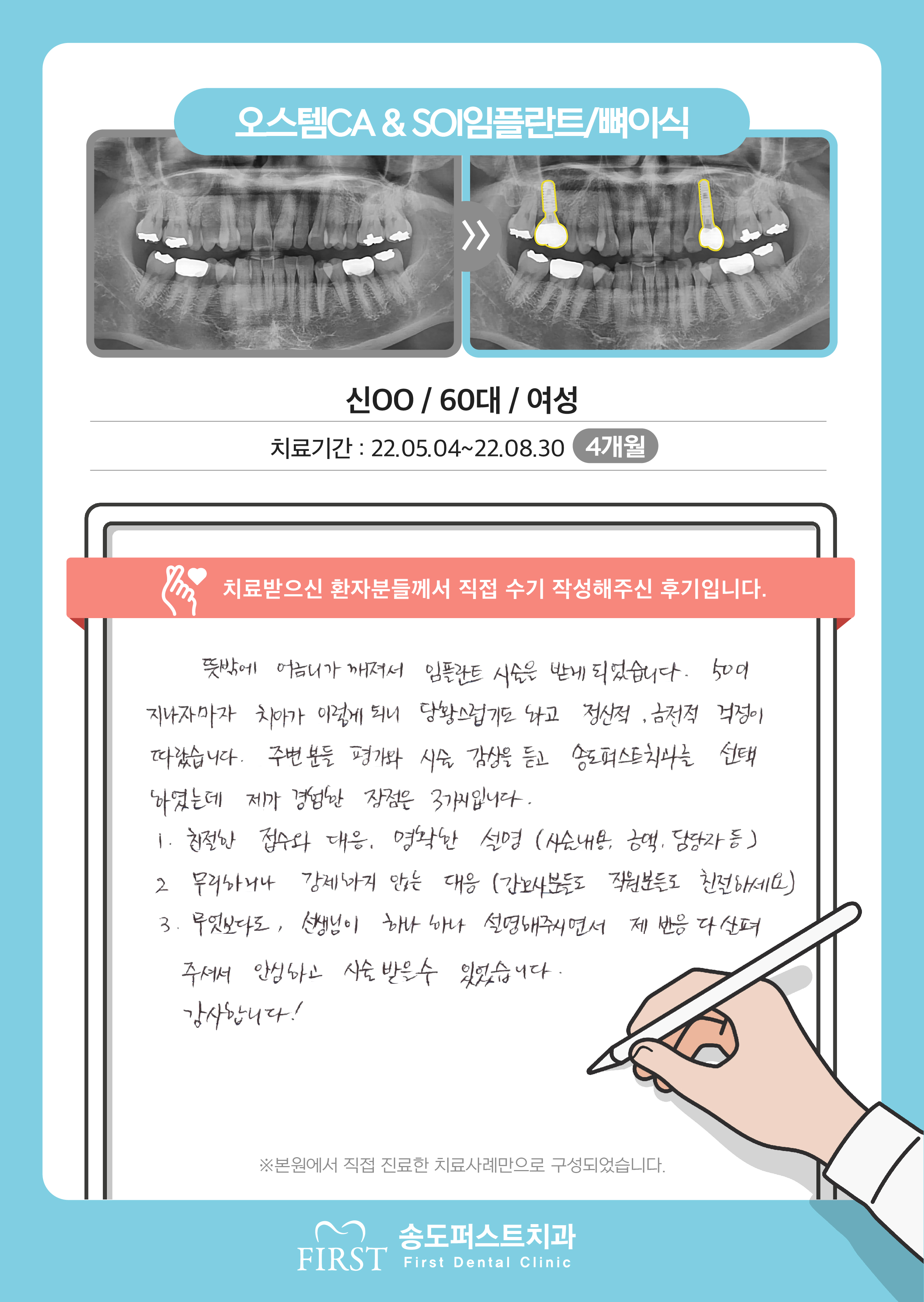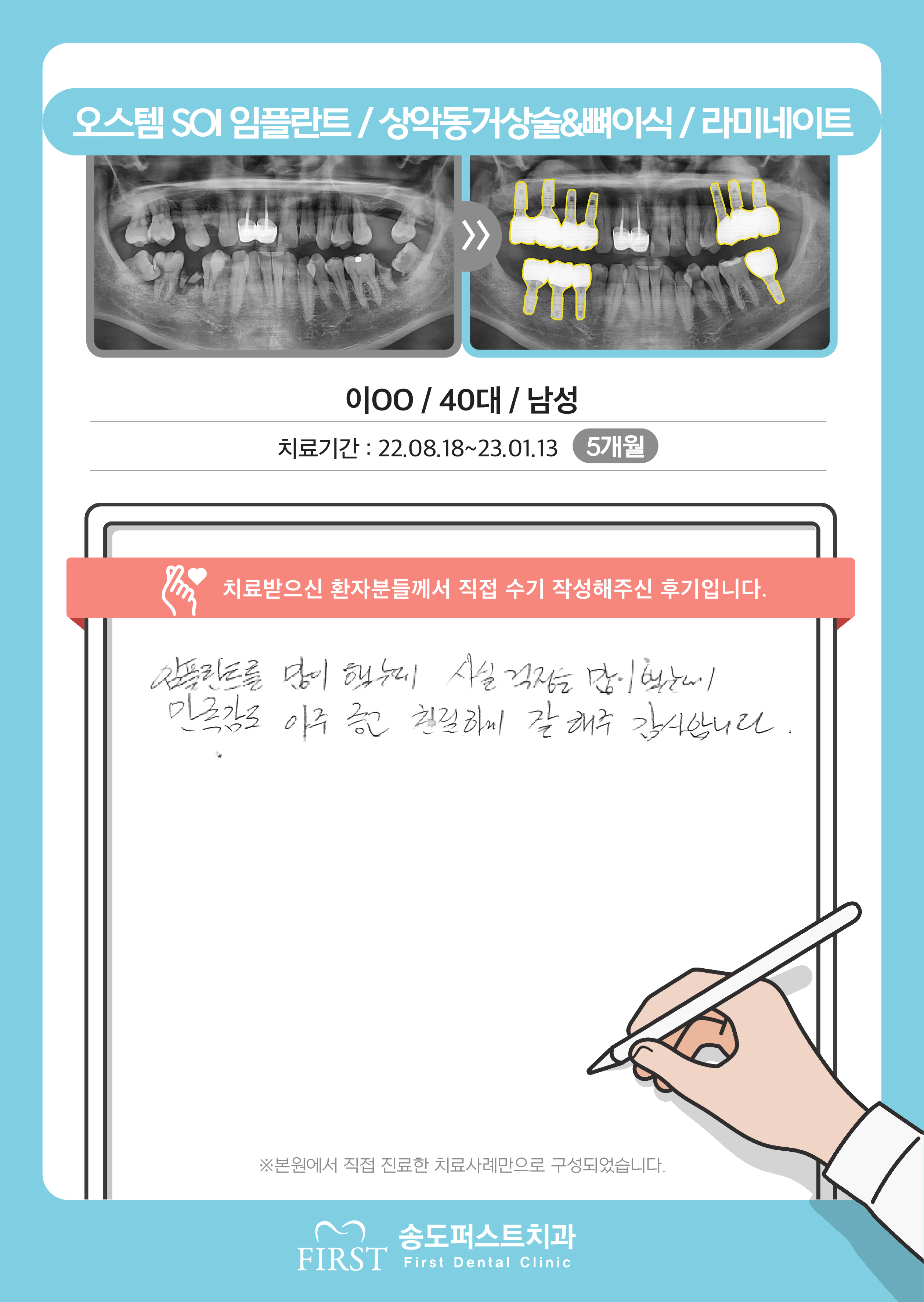 오스템 임플란트/상악동거상술&뼈이식, 긴 시간동안 불편함 없이 잘 치료해서 일상생활이 편해졌습니다.