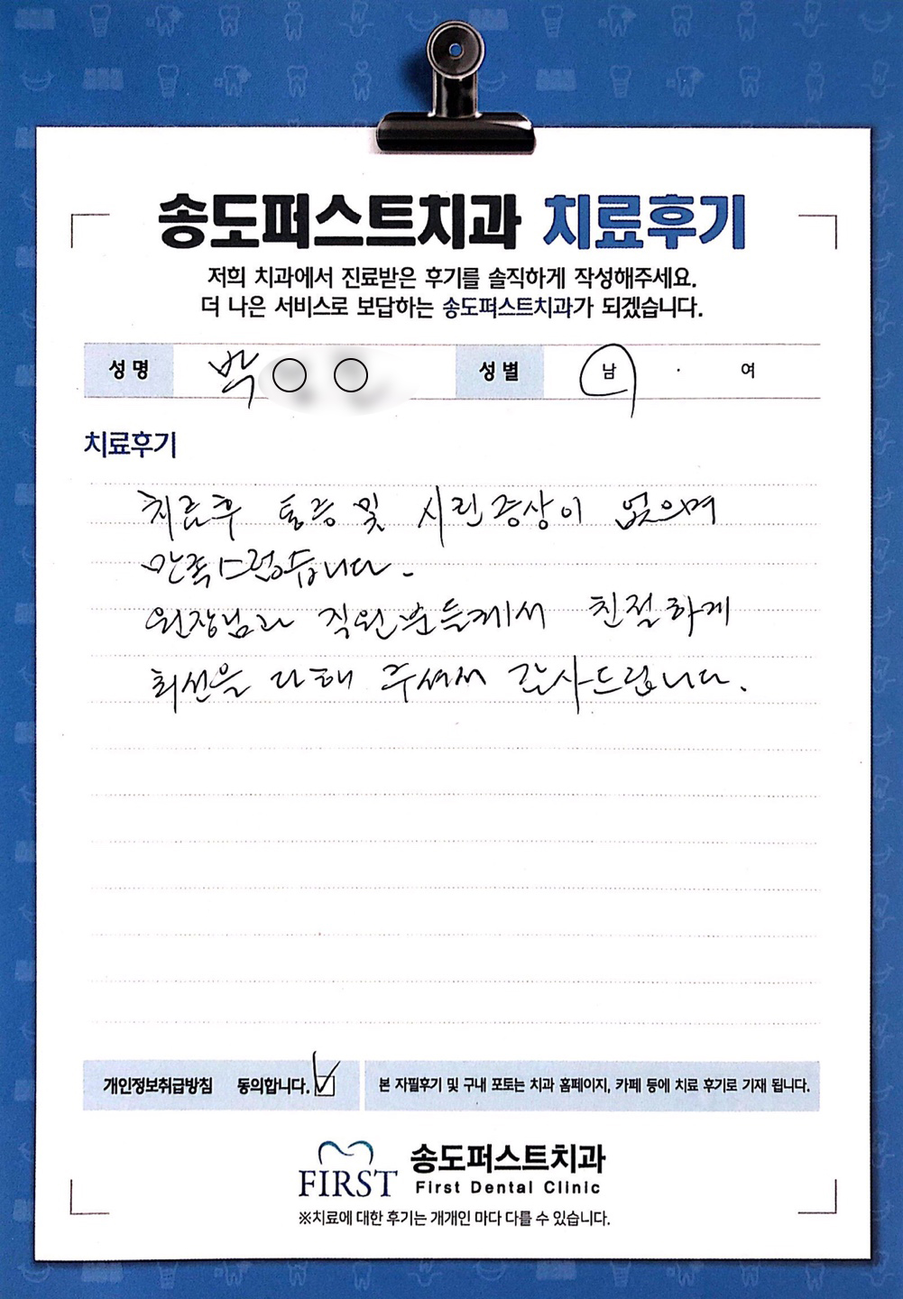 겁먹은 아이에게 부드러운 말투와 유머러스한 이야기를 해주신 실장님 감사합니다.