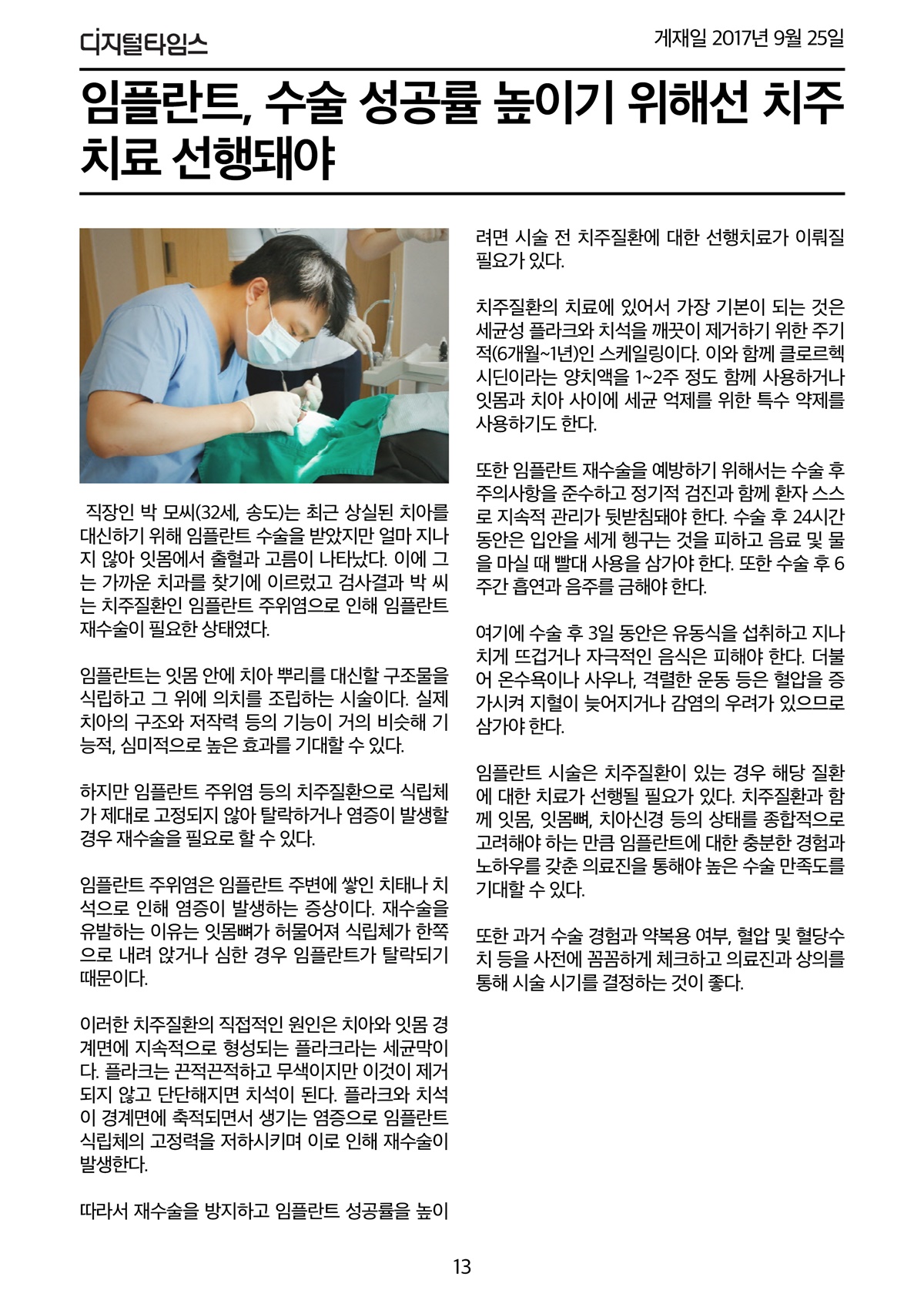 임플란트, 수술 성공률 높이기 위해선 치주치료 선행돼야(2017.09.25)
