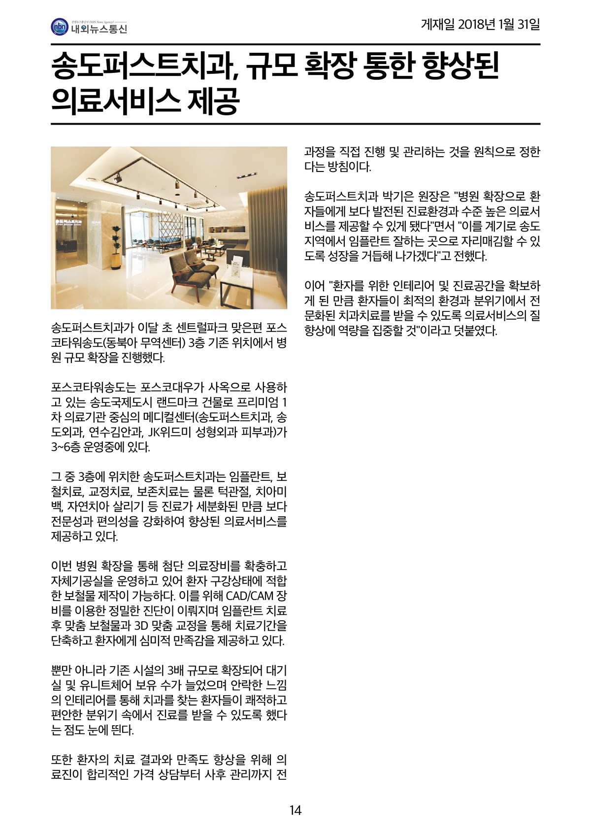 송도퍼스트치과, 규모 확장 통한 향상된 의료서비스 제공(2018.01.31)