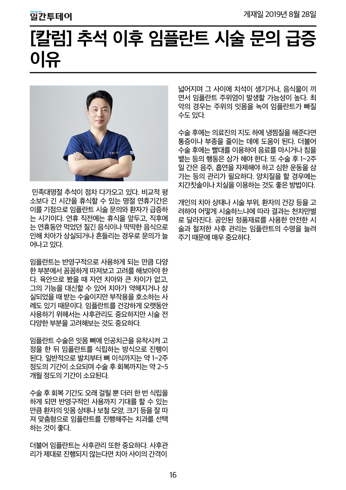 [칼럼] 추석 이후 임플란트 시술 문의 급증 이유(2019.08.28)