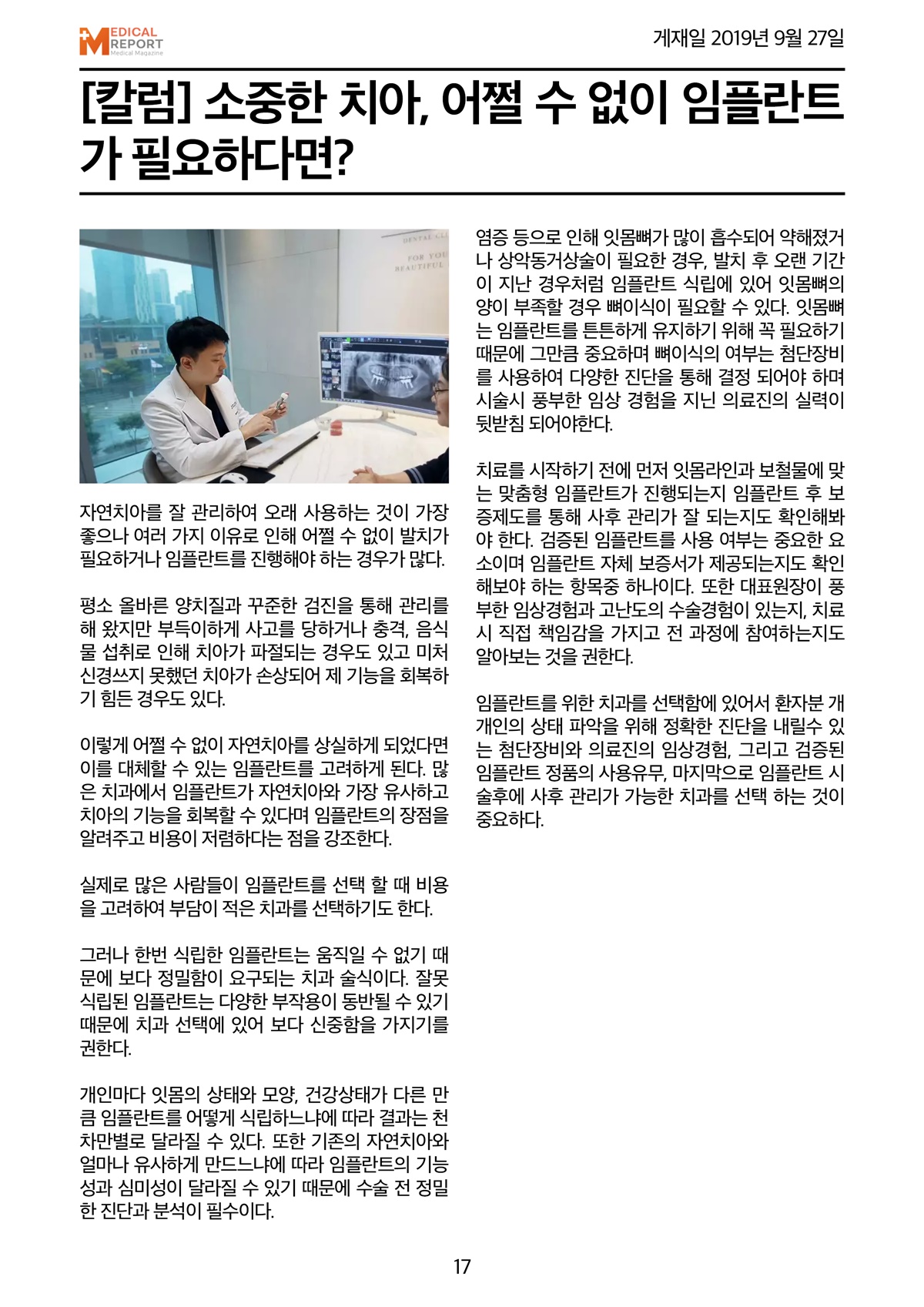 [칼럼] 소중한 치아, 어쩔 수 없이 임플란트가 필요하다면?(2019.09.27)