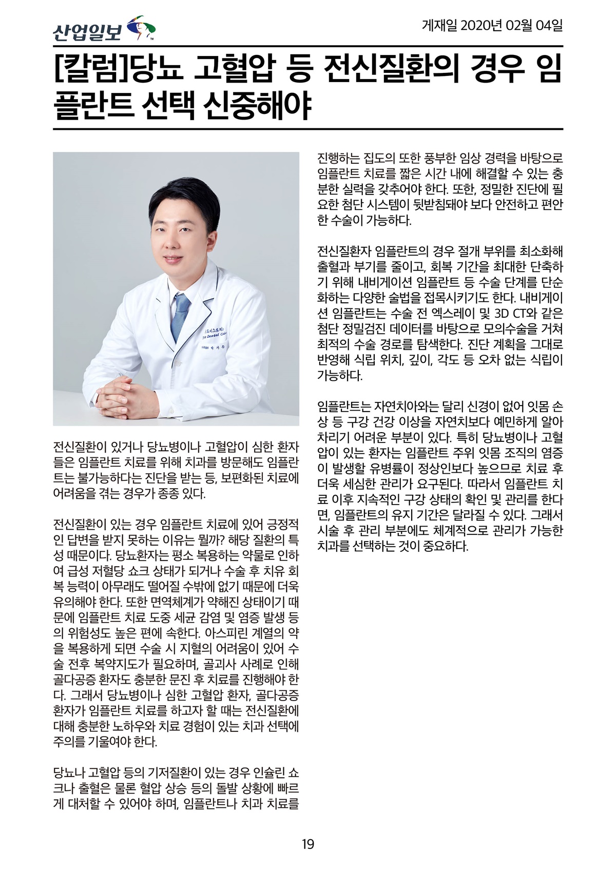 [칼럼]당뇨 고혈압 등 전신질환의 경우 임플란트 선택 신중해야(2020.02.04)