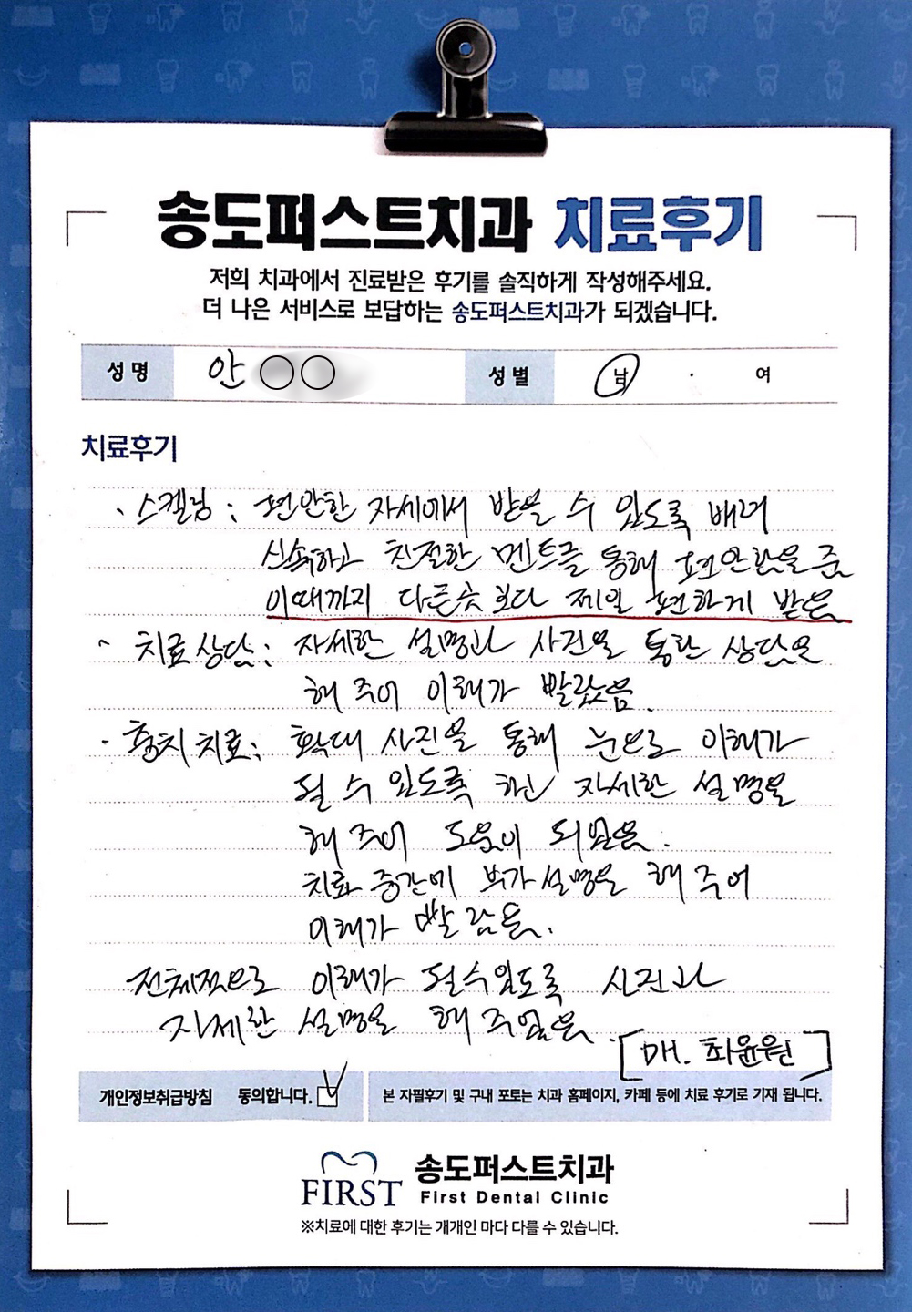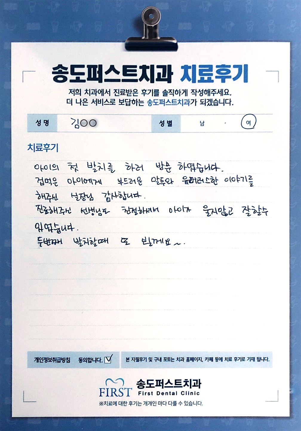 겁먹은 아이에게 부드러운 말투와 유머러스한 이야기를 해주신 실장님 감사합니다.